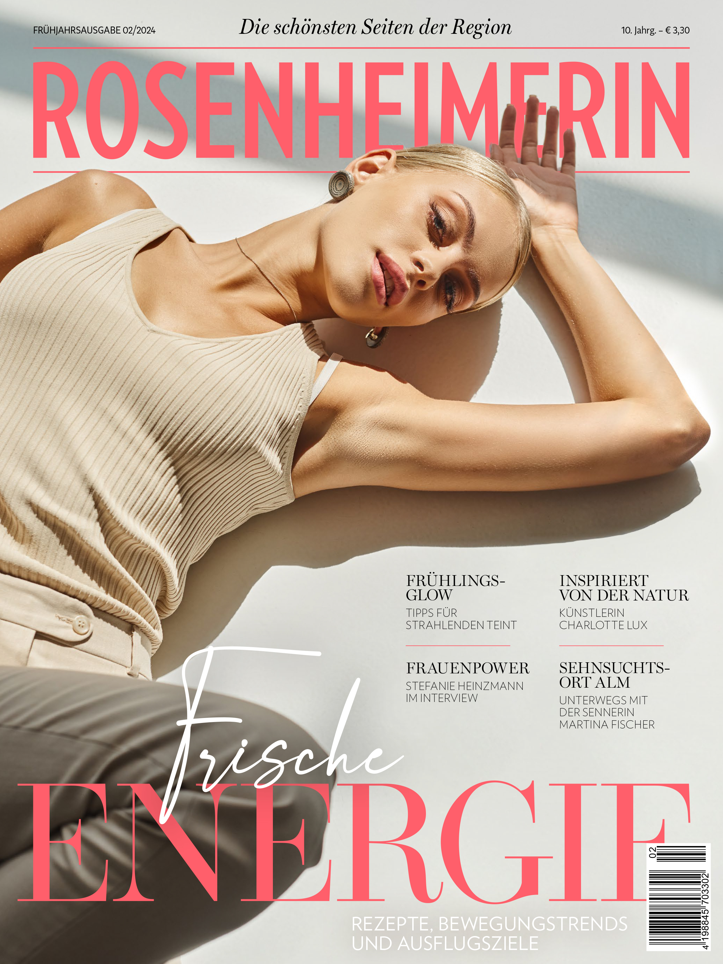 Wir starten in unser Jubiläumsjahr, denn die ROSENHEIMERIN feiert im Herbst Geburtstag. Die erste Ausgabe erschien 2014 und in den zehn Jahren seitdem haben wir viele Frauen porträtiert und in Interviews zu Wort kommen lassen. Entstanden sind spannende, inspirierende und bewegende Geschichten, die zeigen, was unsere Region ausmacht: Engagement, Empathie und jede Menge neue Ideen, die den Alltag bunter machen und mit Leben füllen. Wie die Fotografin Cécile Pierrot und die Künstlerin Agnes Maria Lindner. Sie haben sich mit der Pop-up-Galerie foyer33 ihren Traum erfüllt und zeitgenössische Kunst ins Zentrum von Rosenheim gebracht. Oder die Mütterpflegerin Vroni Hilger aus Höslwang. Sie steht Frauen im Wochenbett bei und macht sich stark dafür, dass mehr junge Mütter Hilfe erhalten. Oder die Autorin Melanie Binder aus Kolbermoor. Sie hat sich nach einem Burnout mit Selbstliebe beschäftigt und darüber zwei Bestseller geschrieben, die einen Schritt für Schritt auf dem Weg zu mehr Selbstvertrauen und Selbstwert begleiten.